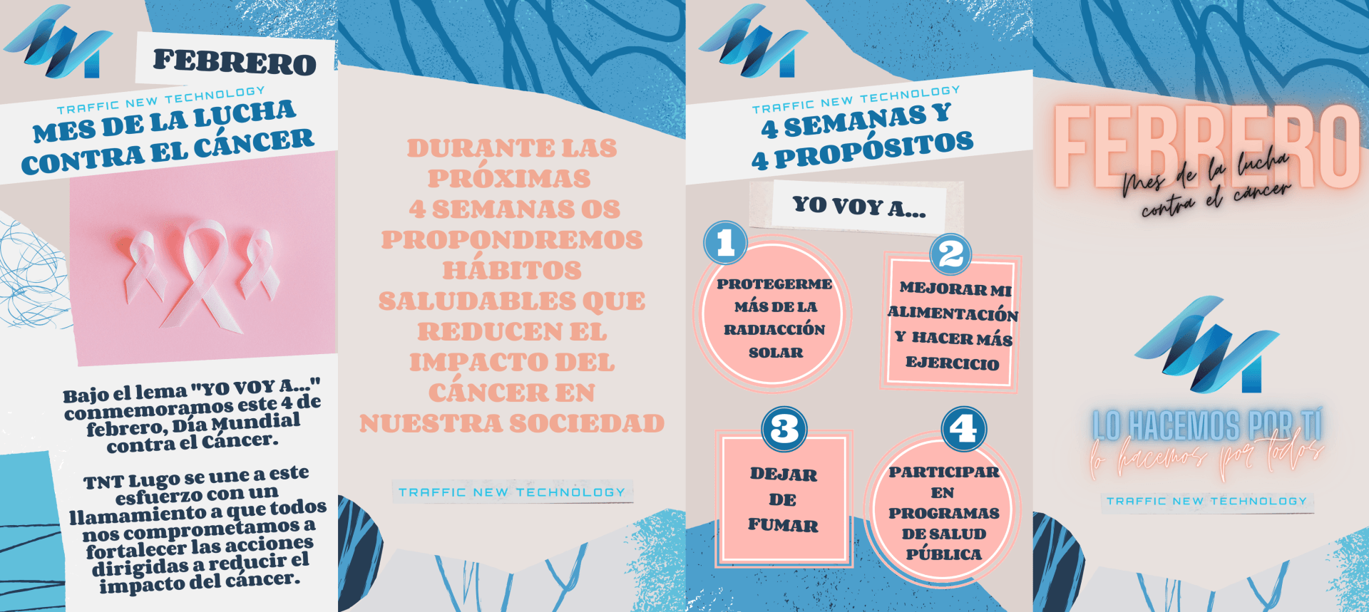 El 4 de febrero se conmemora a nivel mundial el "Día mundial contra el cáncer" y en Traffic New Technology hemos querido aprovechar para concienciar a nuestro equipo en relación a la importancia de tener hábitos de vida saludable y el impacto que tienen en la incidencia del cáncer en nuestra sociedad. A lo largo de cuatro semanas hemos compartido consejos para una dieta saludable, ventajas de realizar ejercicio físico regularmente y hemos conseguido descuentos para nuestros empleados en importantes centros deportivos de nuestra ciudad, Altafit y CTX. También hemos informado sobre los riesgos de la exposición al sol y las lámparas de luz UV, el impacto del humo de tabaco en fumadores y quienes conviven con ellos y algunos consejos para que dejarlo sea más fácil. Por último hemos querido informar sobre programas de salud pública a los que todos tenemos acceso a través del sistema público de salud y que pueden ser vitales para mantener a raya o detectar de forma temprana varios tipos de cáncer y otras enfermedades. Cuatro semanas y cuatro propuestas que aportan su granito de arena para mejorar nuestra salud física y mental.